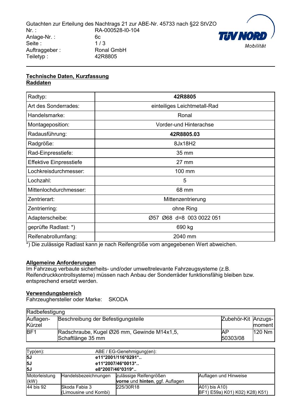Dieses Gutachten (abe) bezieht sich auf die Alufelge brand-ronal 42R8805 in der Ausführung 8Jx18 ET 0, Mittenloch 0 mm (KBA 45733). Im PDF findest du typischerweise zulässige Reifengrößen, Auflagen/Anbauhinweise und – je nach Dokument – Hinweise zur Eintragung.