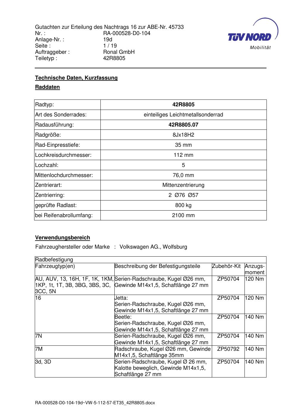 Dieses Gutachten (abe) bezieht sich auf die Alufelge brand-ronal 42R8805 in der Ausführung 8Jx18 ET 0, Mittenloch 0 mm (KBA 45733). Im PDF findest du typischerweise zulässige Reifengrößen, Auflagen/Anbauhinweise und – je nach Dokument – Hinweise zur Eintragung.