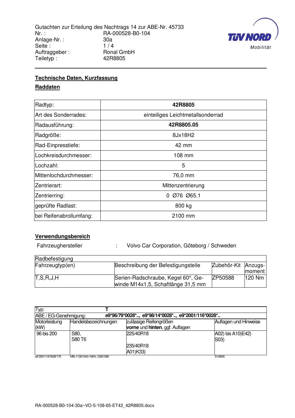Dieses Gutachten (abe) bezieht sich auf die Alufelge brand-ronal 42R8805 in der Ausführung 8Jx18 ET 0, Mittenloch 0 mm (KBA 45733). Im PDF findest du typischerweise zulässige Reifengrößen, Auflagen/Anbauhinweise und – je nach Dokument – Hinweise zur Eintragung.