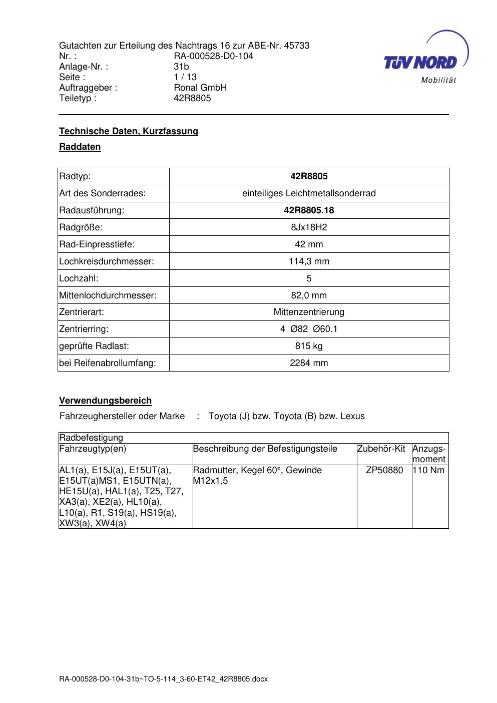 Dieses Gutachten (abe) bezieht sich auf die Alufelge brand-ronal 42R8805 in der Ausführung 8Jx18 ET 0, Mittenloch 0 mm (KBA 45733). Im PDF findest du typischerweise zulässige Reifengrößen, Auflagen/Anbauhinweise und – je nach Dokument – Hinweise zur Eintragung.