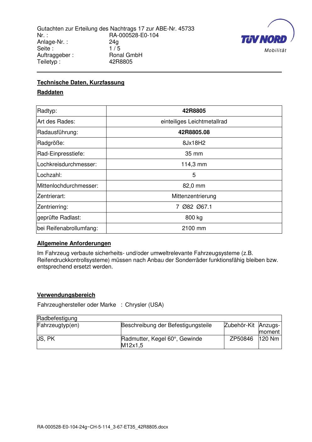 Dieses Gutachten (abe) bezieht sich auf die Alufelge brand-ronal 42R8805 in der Ausführung 8Jx18 ET 0, Mittenloch 0 mm (KBA 45733). Im PDF findest du typischerweise zulässige Reifengrößen, Auflagen/Anbauhinweise und – je nach Dokument – Hinweise zur Eintragung.