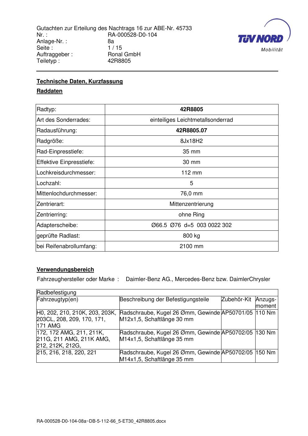 Dieses Gutachten (abe) bezieht sich auf die Alufelge brand-ronal 42R8805 in der Ausführung 8Jx18 ET 0, Mittenloch 0 mm (KBA 45733). Im PDF findest du typischerweise zulässige Reifengrößen, Auflagen/Anbauhinweise und – je nach Dokument – Hinweise zur Eintragung.