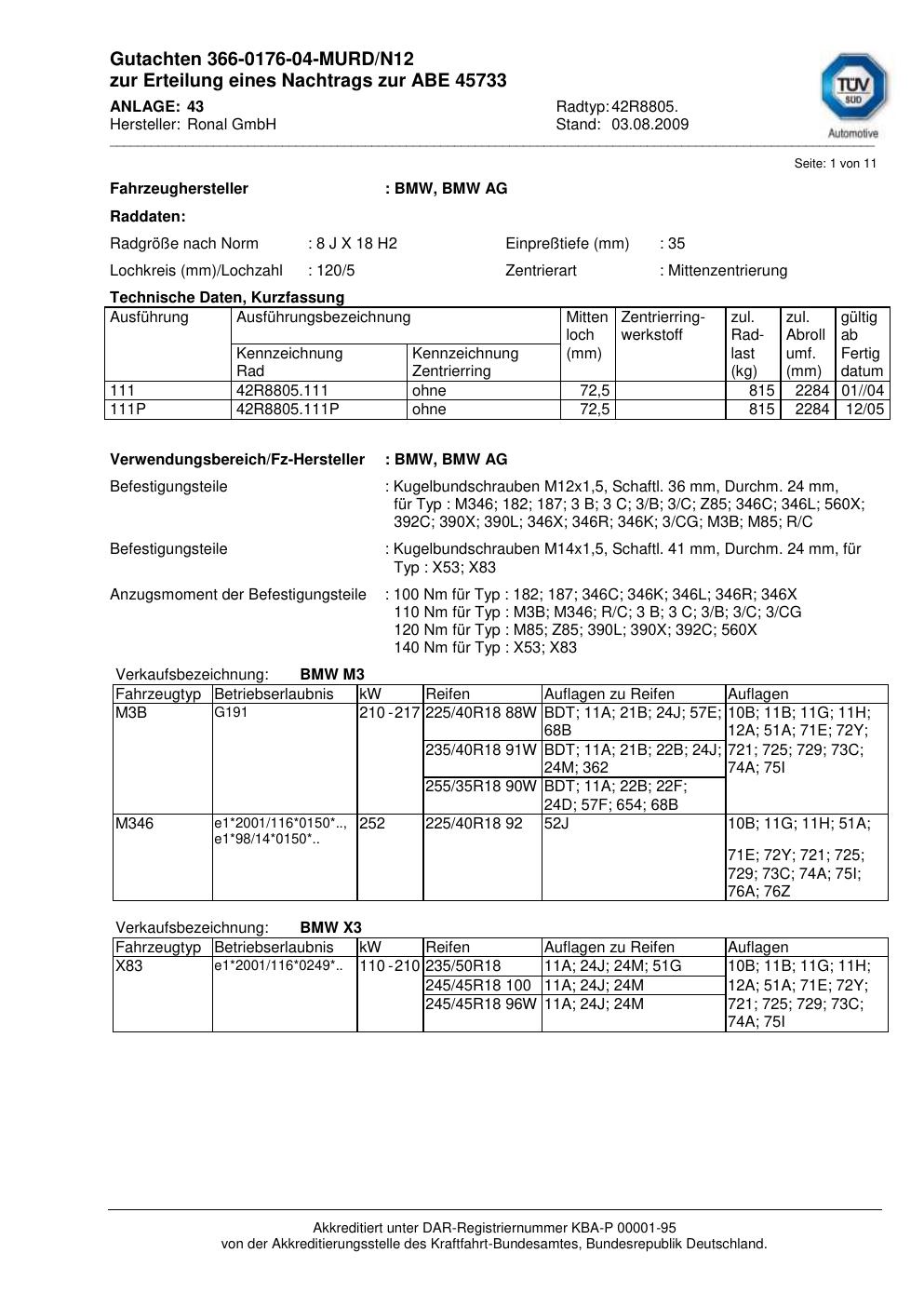 Dieses Gutachten (abe) bezieht sich auf die Alufelge Ronal 42R8805 in der Ausführung 8Jx18 ET 0, Mittenloch 0 mm (KBA 45733). Im PDF findest du typischerweise zulässige Reifengrößen, Auflagen/Anbauhinweise und – je nach Dokument – Hinweise zur Eintragung.
