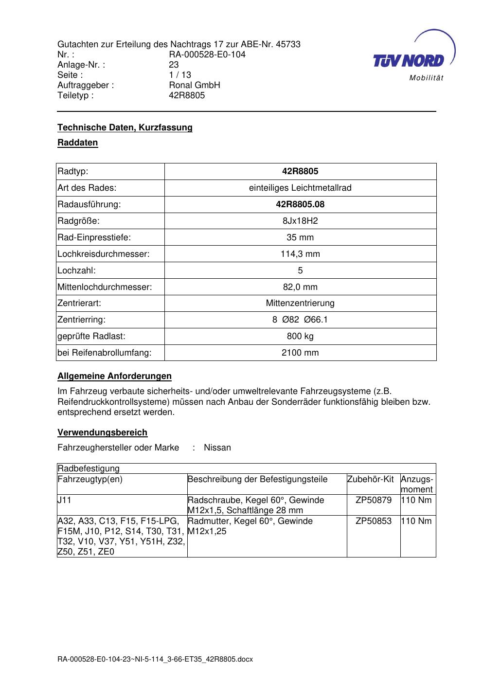 Dieses Gutachten (abe) bezieht sich auf die Alufelge brand-ronal 42R8805 in der Ausführung 8Jx18 ET 0, Mittenloch 0 mm (KBA 45733). Im PDF findest du typischerweise zulässige Reifengrößen, Auflagen/Anbauhinweise und – je nach Dokument – Hinweise zur Eintragung.