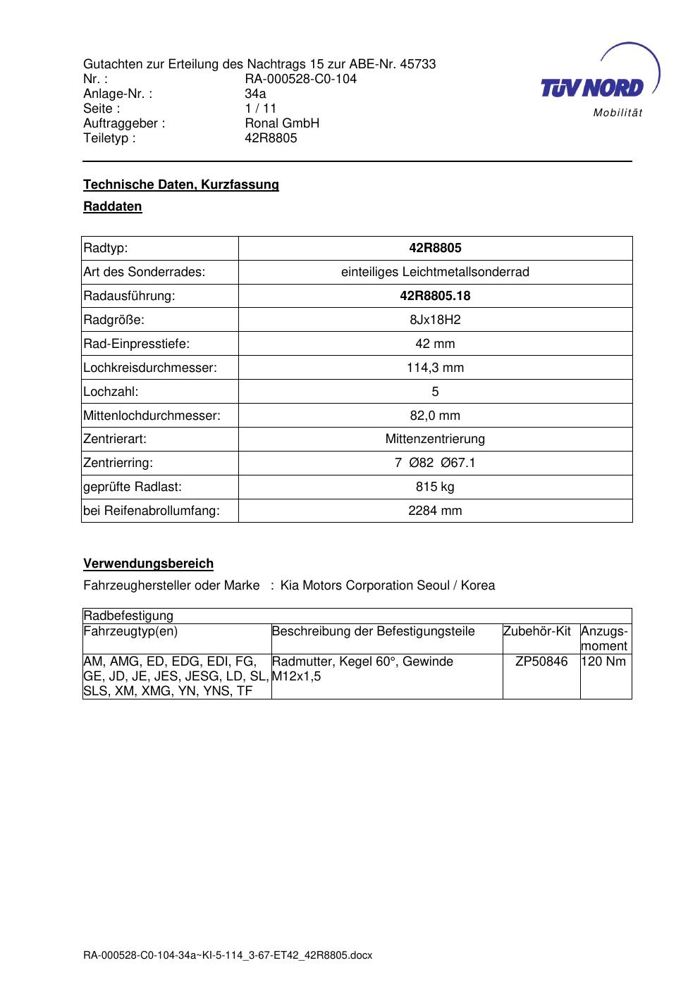 Dieses Gutachten (abe) bezieht sich auf die Alufelge brand-ronal 42R8805 in der Ausführung 8Jx18 ET 0, Mittenloch 0 mm (KBA 45733). Im PDF findest du typischerweise zulässige Reifengrößen, Auflagen/Anbauhinweise und – je nach Dokument – Hinweise zur Eintragung.