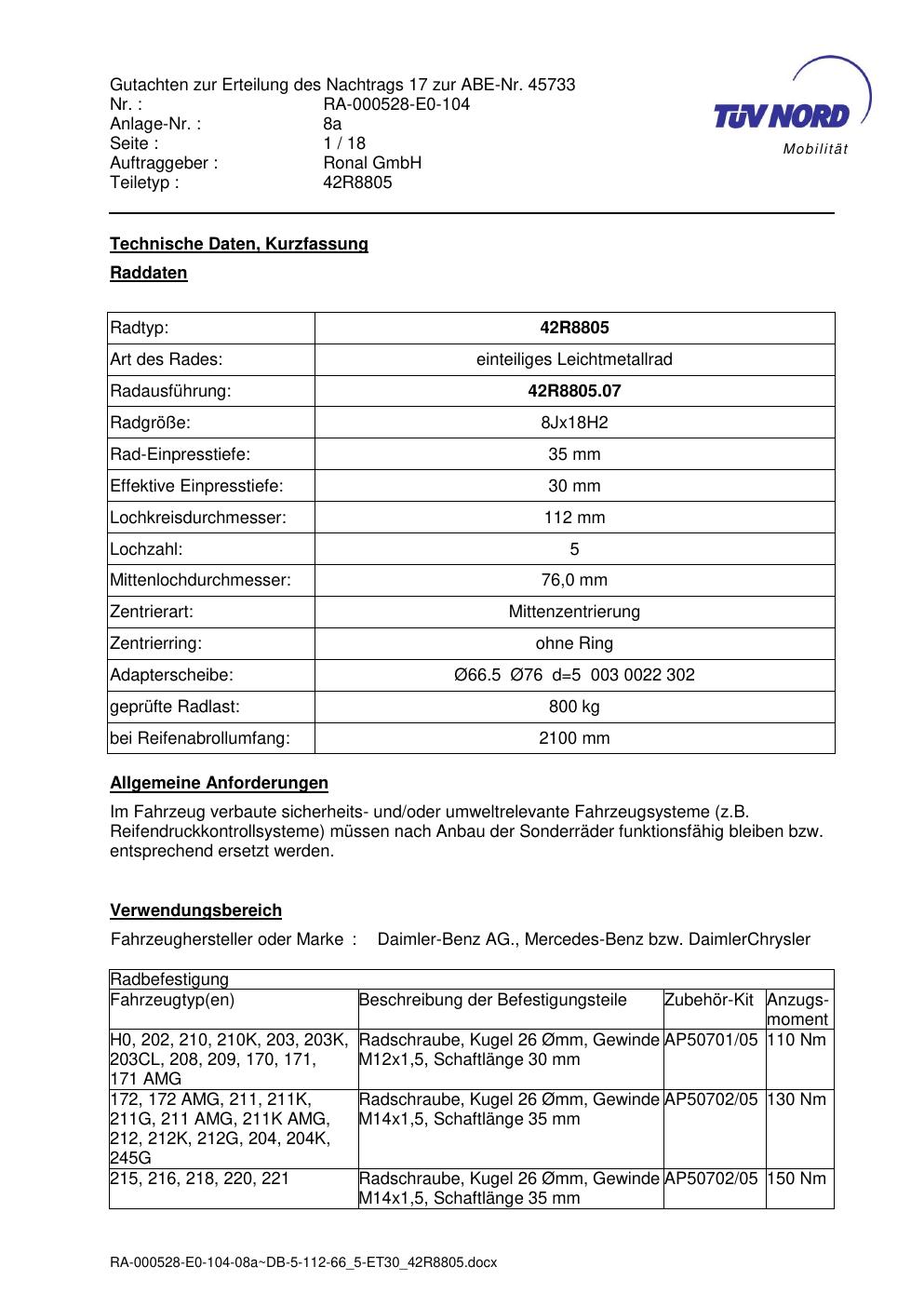 Dieses Gutachten (abe) bezieht sich auf die Alufelge brand-ronal 42R8805 in der Ausführung 8Jx18 ET 0, Mittenloch 0 mm (KBA 45733). Im PDF findest du typischerweise zulässige Reifengrößen, Auflagen/Anbauhinweise und – je nach Dokument – Hinweise zur Eintragung.