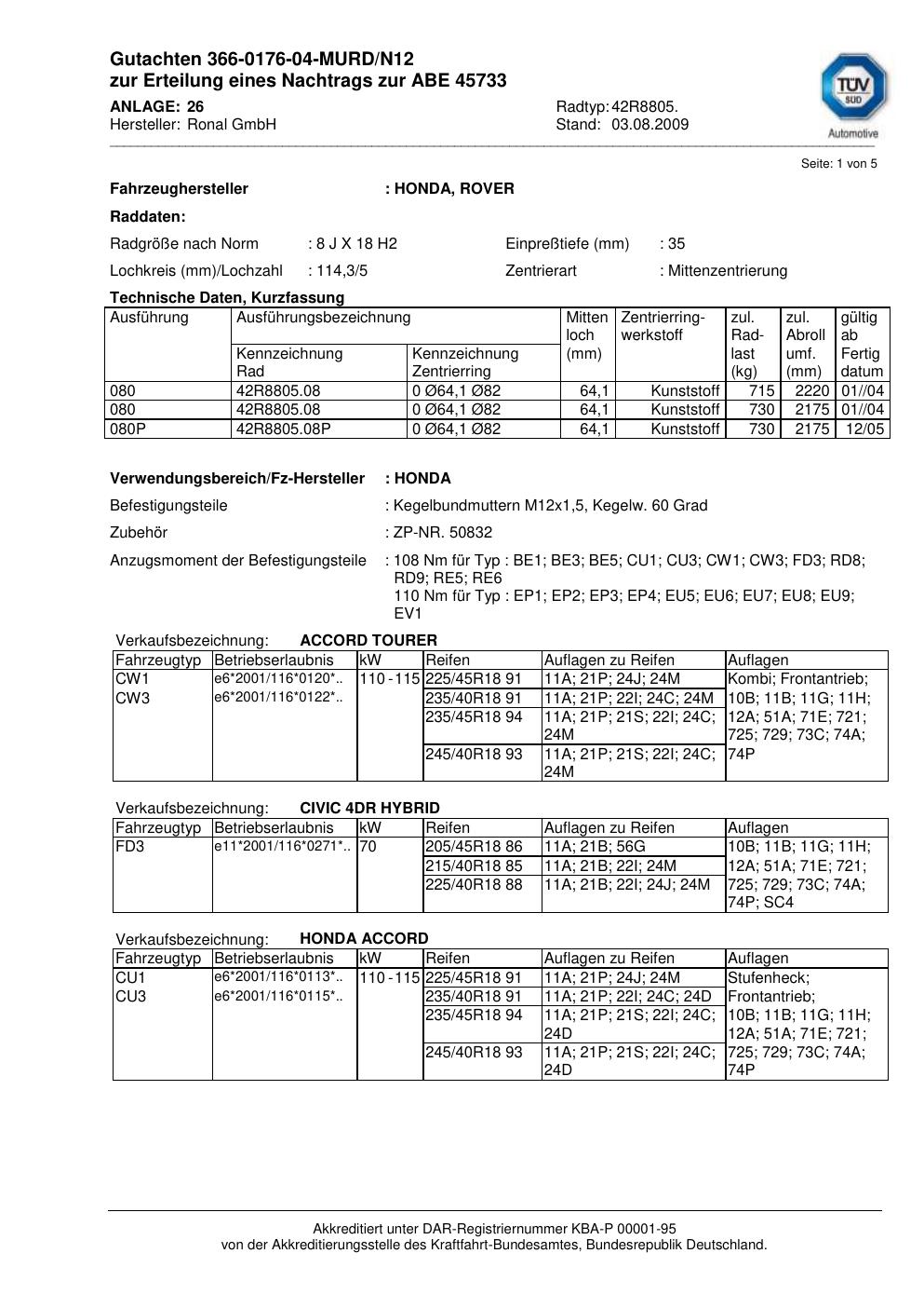 Dieses Gutachten (abe) bezieht sich auf die Alufelge Ronal 42R8805 in der Ausführung 8Jx18 ET 0, Mittenloch 0 mm (KBA 45733). Im PDF findest du typischerweise zulässige Reifengrößen, Auflagen/Anbauhinweise und – je nach Dokument – Hinweise zur Eintragung.