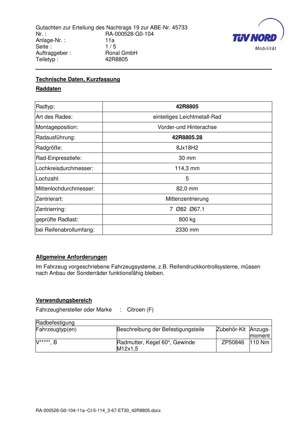 Dieses Gutachten (abe) bezieht sich auf die Alufelge brand-ronal 42R8805 in der Ausführung 8Jx18 ET 0, Mittenloch 0 mm (KBA 45733). Im PDF findest du typischerweise zulässige Reifengrößen, Auflagen/Anbauhinweise und – je nach Dokument – Hinweise zur Eintragung.