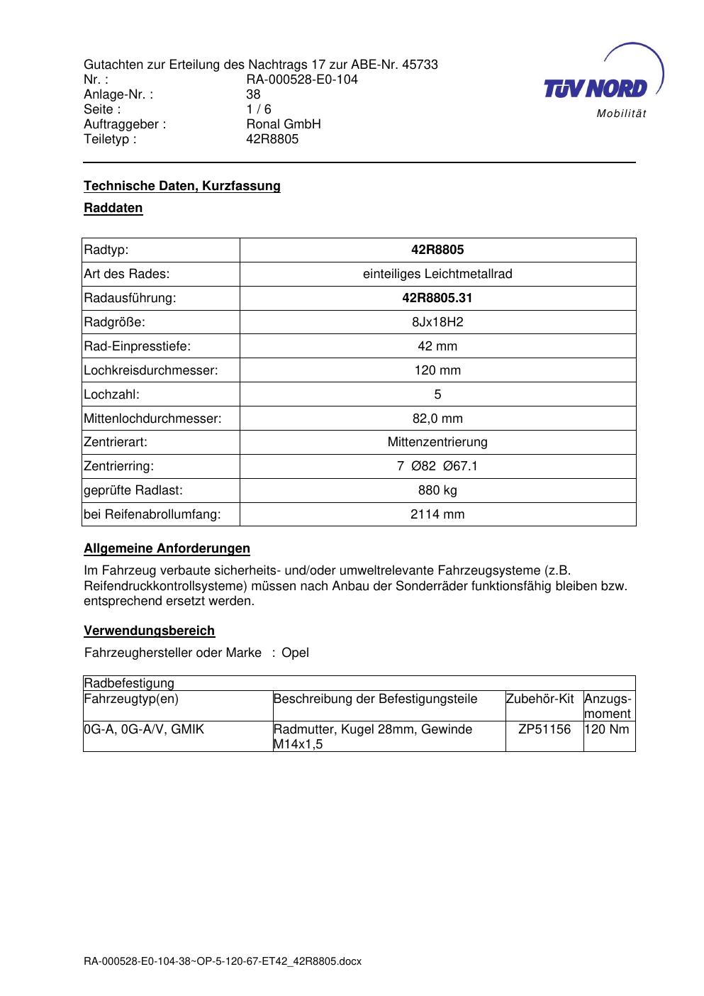 Dieses Gutachten (abe) bezieht sich auf die Alufelge brand-ronal 42R8805 in der Ausführung 8Jx18 ET 0, Mittenloch 0 mm (KBA 45733). Im PDF findest du typischerweise zulässige Reifengrößen, Auflagen/Anbauhinweise und – je nach Dokument – Hinweise zur Eintragung.