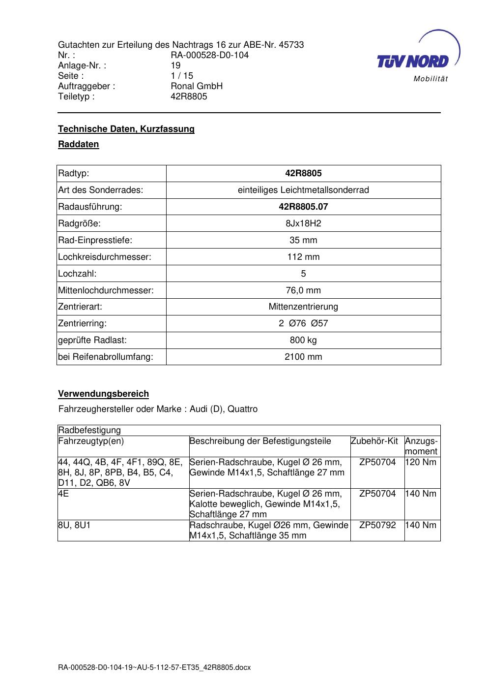 Dieses Gutachten (abe) bezieht sich auf die Alufelge brand-ronal 42R8805 in der Ausführung 8Jx18 ET 0, Mittenloch 0 mm (KBA 45733). Im PDF findest du typischerweise zulässige Reifengrößen, Auflagen/Anbauhinweise und – je nach Dokument – Hinweise zur Eintragung.