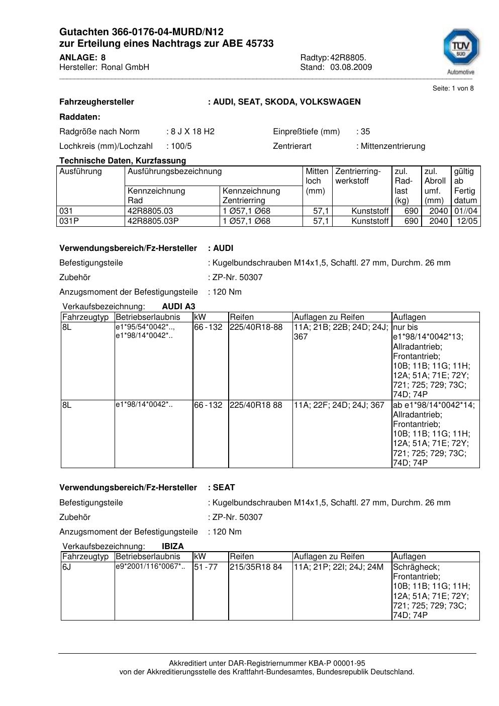Dieses Gutachten (abe) bezieht sich auf die Alufelge Ronal 42R8805 in der Ausführung 8Jx18 ET 0, Mittenloch 0 mm (KBA 45733). Im PDF findest du typischerweise zulässige Reifengrößen, Auflagen/Anbauhinweise und – je nach Dokument – Hinweise zur Eintragung.