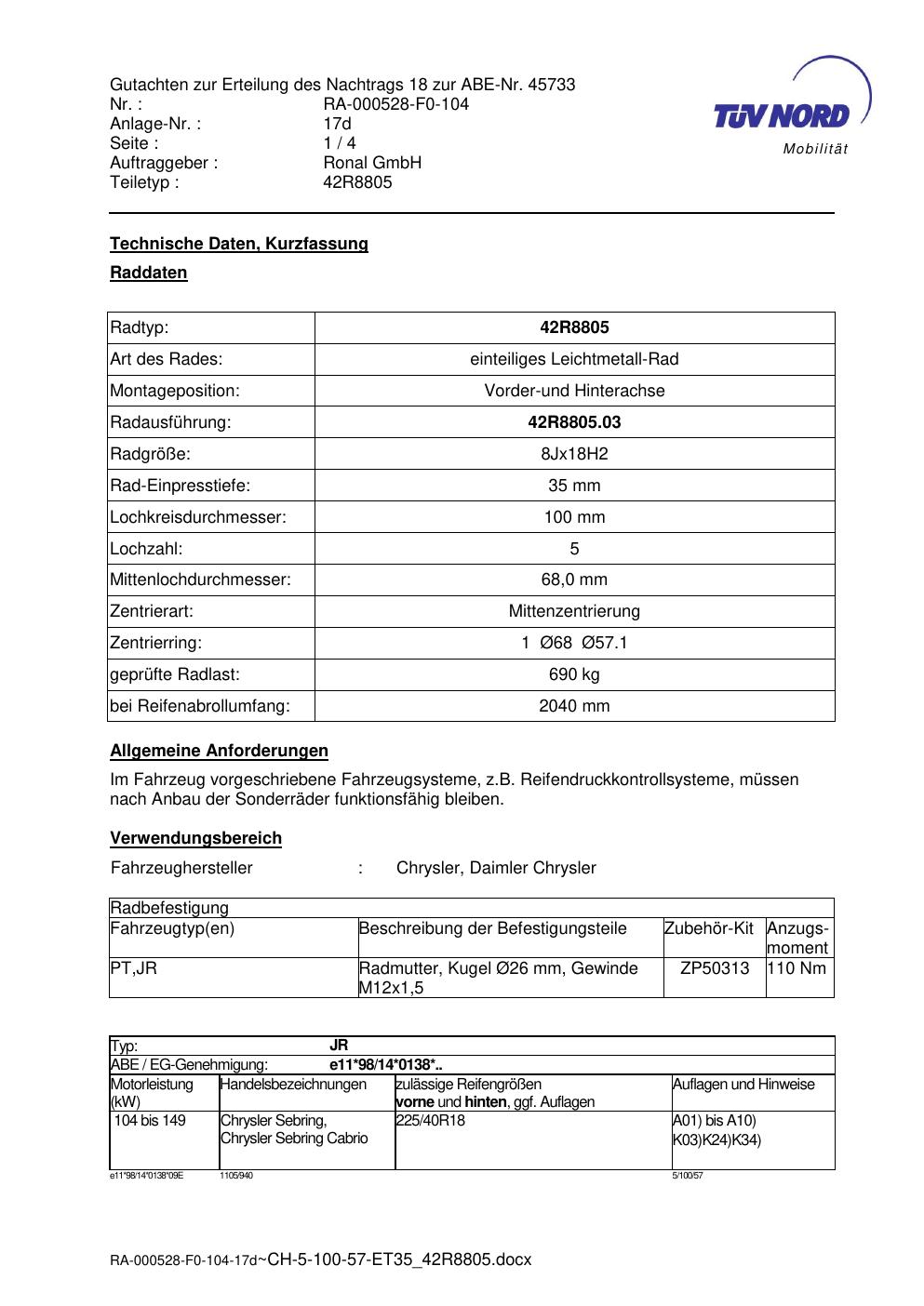 Dieses Gutachten (abe) bezieht sich auf die Alufelge brand-ronal 42R8805 in der Ausführung 8Jx18 ET 0, Mittenloch 0 mm (KBA 45733). Im PDF findest du typischerweise zulässige Reifengrößen, Auflagen/Anbauhinweise und – je nach Dokument – Hinweise zur Eintragung.