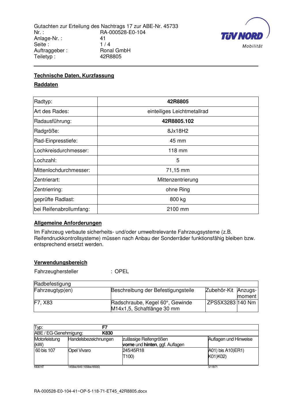 Dieses Gutachten (abe) bezieht sich auf die Alufelge brand-ronal 42R8805 in der Ausführung 8Jx18 ET 0, Mittenloch 0 mm (KBA 45733). Im PDF findest du typischerweise zulässige Reifengrößen, Auflagen/Anbauhinweise und – je nach Dokument – Hinweise zur Eintragung.