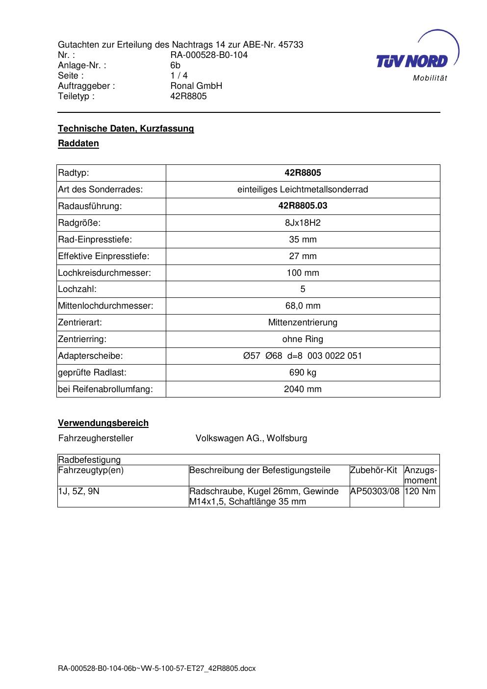 Dieses Gutachten (abe) bezieht sich auf die Alufelge brand-ronal 42R8805 in der Ausführung 8Jx18 ET 0, Mittenloch 0 mm (KBA 45733). Im PDF findest du typischerweise zulässige Reifengrößen, Auflagen/Anbauhinweise und – je nach Dokument – Hinweise zur Eintragung.
