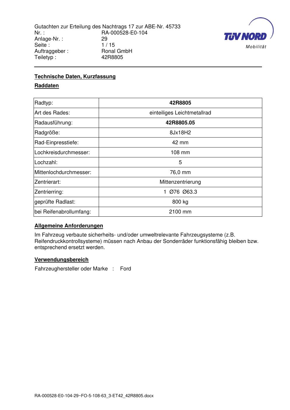 Dieses Gutachten (abe) bezieht sich auf die Alufelge brand-ronal 42R8805 in der Ausführung 8Jx18 ET 0, Mittenloch 0 mm (KBA 45733). Im PDF findest du typischerweise zulässige Reifengrößen, Auflagen/Anbauhinweise und – je nach Dokument – Hinweise zur Eintragung.
