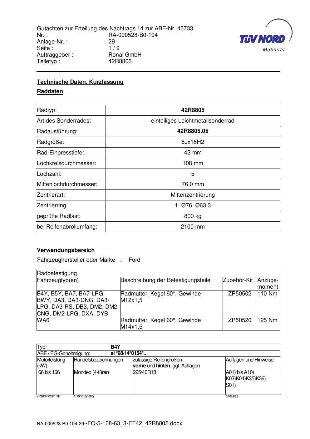 Dieses Gutachten (abe) bezieht sich auf die Alufelge brand-ronal 42R8805 in der Ausführung 8Jx18 ET 0, Mittenloch 0 mm (KBA 45733). Im PDF findest du typischerweise zulässige Reifengrößen, Auflagen/Anbauhinweise und – je nach Dokument – Hinweise zur Eintragung.