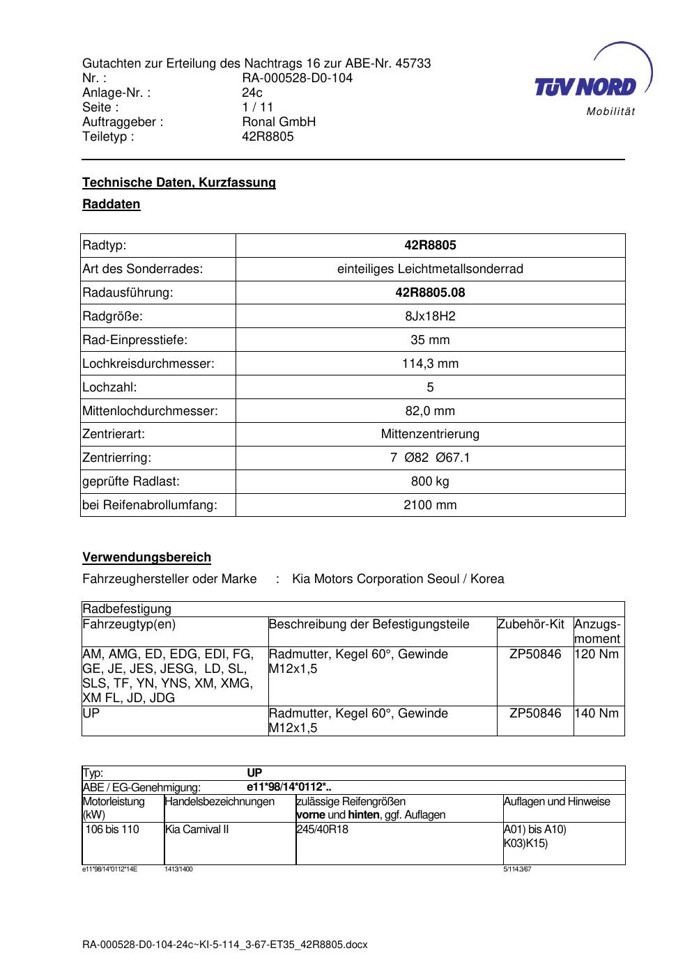 Dieses Gutachten (abe) bezieht sich auf die Alufelge brand-ronal 42R8805 in der Ausführung 8Jx18 ET 0, Mittenloch 0 mm (KBA 45733). Im PDF findest du typischerweise zulässige Reifengrößen, Auflagen/Anbauhinweise und – je nach Dokument – Hinweise zur Eintragung.
