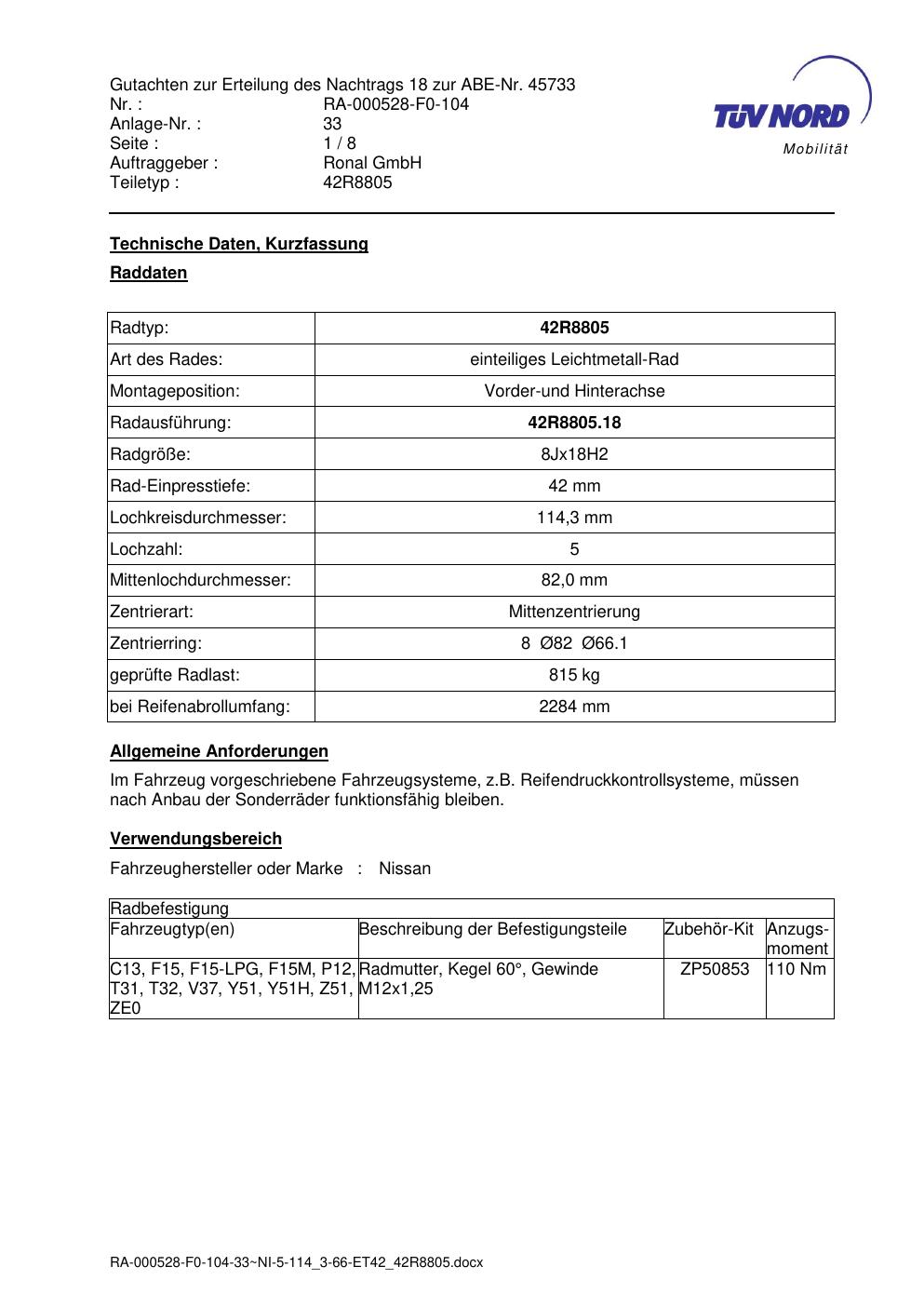 Dieses Gutachten (abe) bezieht sich auf die Alufelge brand-ronal 42R8805 in der Ausführung 8Jx18 ET 0, Mittenloch 0 mm (KBA 45733). Im PDF findest du typischerweise zulässige Reifengrößen, Auflagen/Anbauhinweise und – je nach Dokument – Hinweise zur Eintragung.