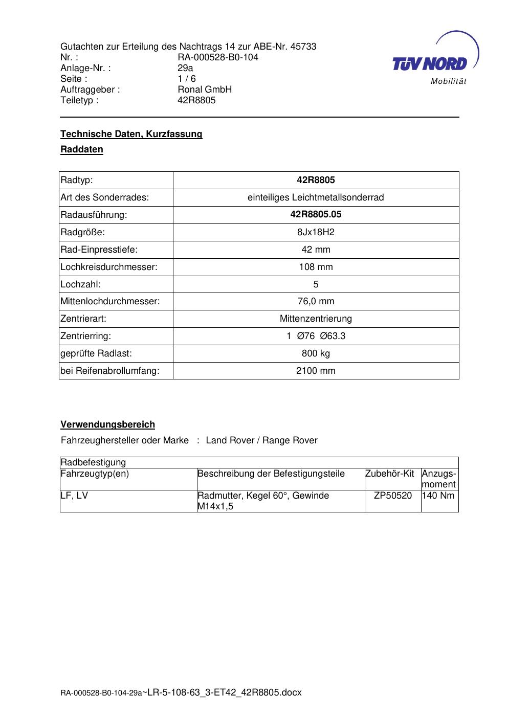 Dieses Gutachten (abe) bezieht sich auf die Alufelge brand-ronal 42R8805 in der Ausführung 8Jx18 ET 0, Mittenloch 0 mm (KBA 45733). Im PDF findest du typischerweise zulässige Reifengrößen, Auflagen/Anbauhinweise und – je nach Dokument – Hinweise zur Eintragung.