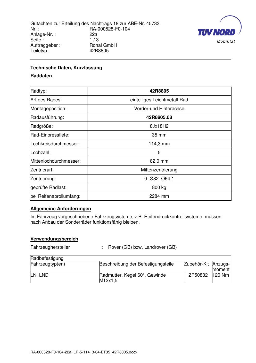 Dieses Gutachten (abe) bezieht sich auf die Alufelge brand-ronal 42R8805 in der Ausführung 8Jx18 ET 0, Mittenloch 0 mm (KBA 45733). Im PDF findest du typischerweise zulässige Reifengrößen, Auflagen/Anbauhinweise und – je nach Dokument – Hinweise zur Eintragung.