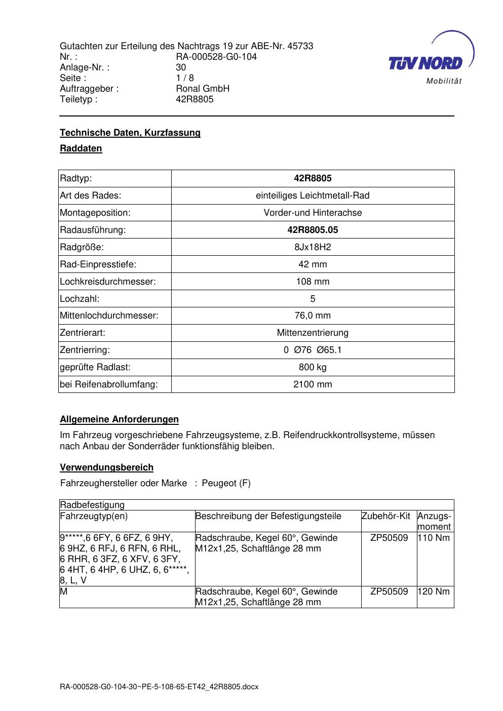 Dieses Gutachten (abe) bezieht sich auf die Alufelge brand-ronal 42R8805 in der Ausführung 8Jx18 ET 0, Mittenloch 0 mm (KBA 45733). Im PDF findest du typischerweise zulässige Reifengrößen, Auflagen/Anbauhinweise und – je nach Dokument – Hinweise zur Eintragung.