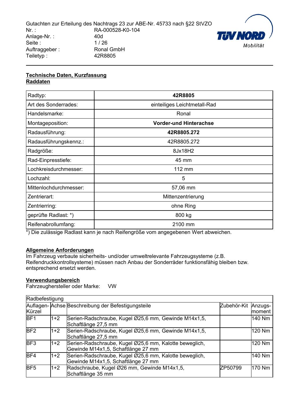 Dieses Gutachten (abe) bezieht sich auf die Alufelge brand-ronal 42R8805 in der Ausführung 8Jx18 ET 0, Mittenloch 0 mm (KBA 45733). Im PDF findest du typischerweise zulässige Reifengrößen, Auflagen/Anbauhinweise und – je nach Dokument – Hinweise zur Eintragung.