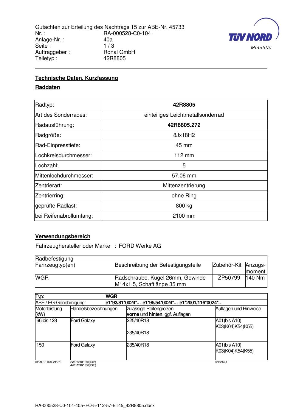 Dieses Gutachten (abe) bezieht sich auf die Alufelge brand-ronal 42R8805 in der Ausführung 8Jx18 ET 0, Mittenloch 0 mm (KBA 45733). Im PDF findest du typischerweise zulässige Reifengrößen, Auflagen/Anbauhinweise und – je nach Dokument – Hinweise zur Eintragung.