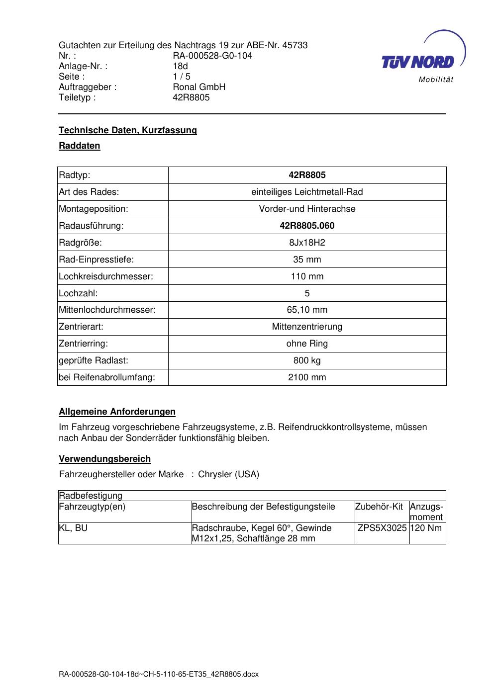 Dieses Gutachten (abe) bezieht sich auf die Alufelge brand-ronal 42R8805 in der Ausführung 8Jx18 ET 0, Mittenloch 0 mm (KBA 45733). Im PDF findest du typischerweise zulässige Reifengrößen, Auflagen/Anbauhinweise und – je nach Dokument – Hinweise zur Eintragung.