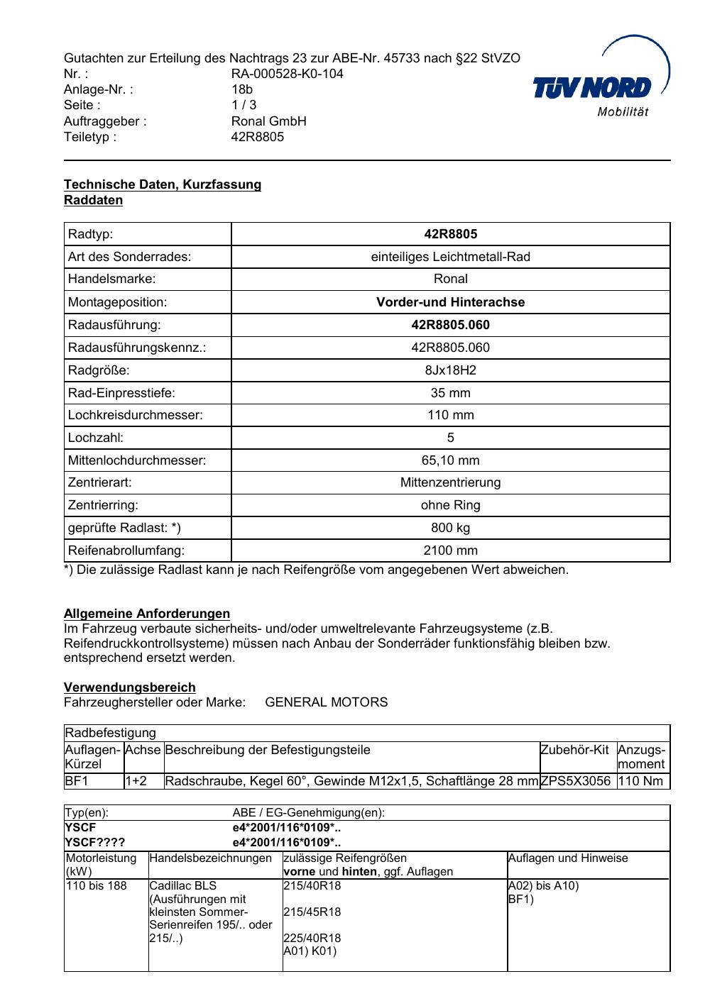 Dieses Gutachten (abe) bezieht sich auf die Alufelge Ronal 42R8805 in der Ausführung 8Jx18 ET 0, Mittenloch 0 mm (KBA 45733). Im PDF findest du typischerweise zulässige Reifengrößen, Auflagen/Anbauhinweise und – je nach Dokument – Hinweise zur Eintragung.