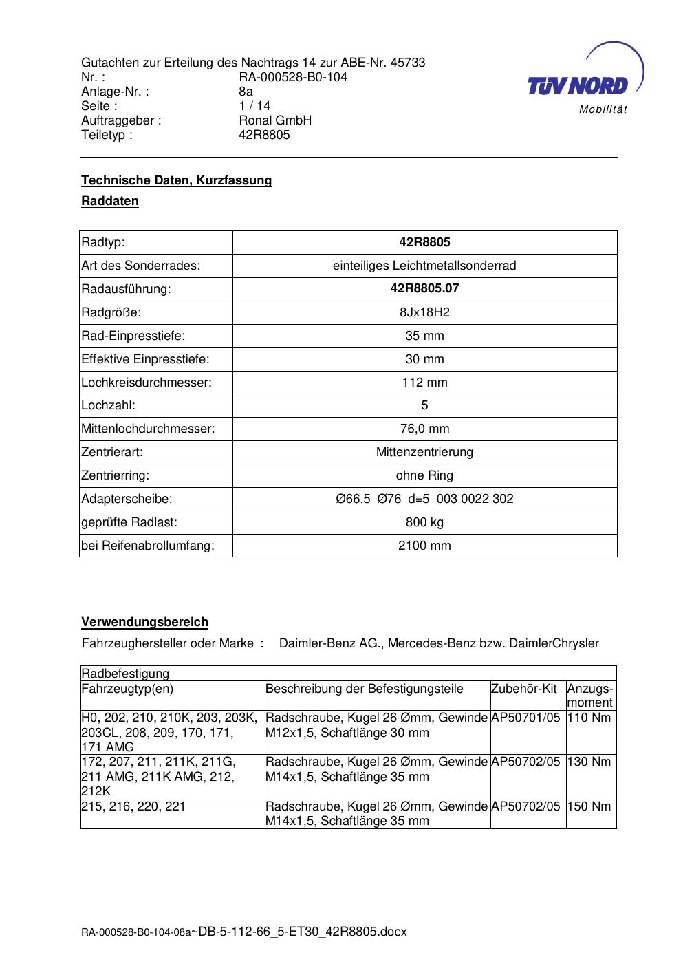 Dieses Gutachten (abe) bezieht sich auf die Alufelge brand-ronal 42R8805 in der Ausführung 8Jx18 ET 0, Mittenloch 0 mm (KBA 45733). Im PDF findest du typischerweise zulässige Reifengrößen, Auflagen/Anbauhinweise und – je nach Dokument – Hinweise zur Eintragung.