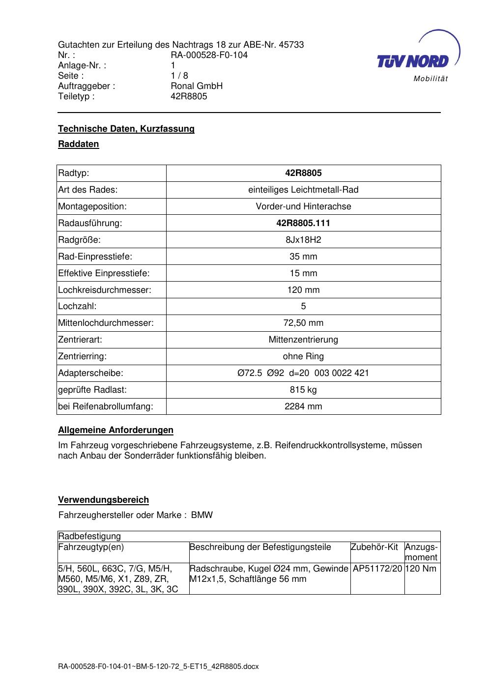 Dieses Gutachten (abe) bezieht sich auf die Alufelge brand-ronal 42R8805 in der Ausführung 8Jx18 ET 0, Mittenloch 0 mm (KBA 45733). Im PDF findest du typischerweise zulässige Reifengrößen, Auflagen/Anbauhinweise und – je nach Dokument – Hinweise zur Eintragung.