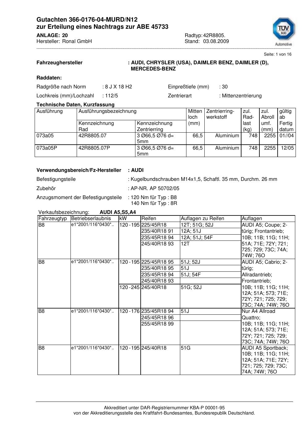 Dieses Gutachten (abe) bezieht sich auf die Alufelge brand-ronal 42R8805 in der Ausführung 8Jx18 ET 0, Mittenloch 0 mm (KBA 45733). Im PDF findest du typischerweise zulässige Reifengrößen, Auflagen/Anbauhinweise und – je nach Dokument – Hinweise zur Eintragung.