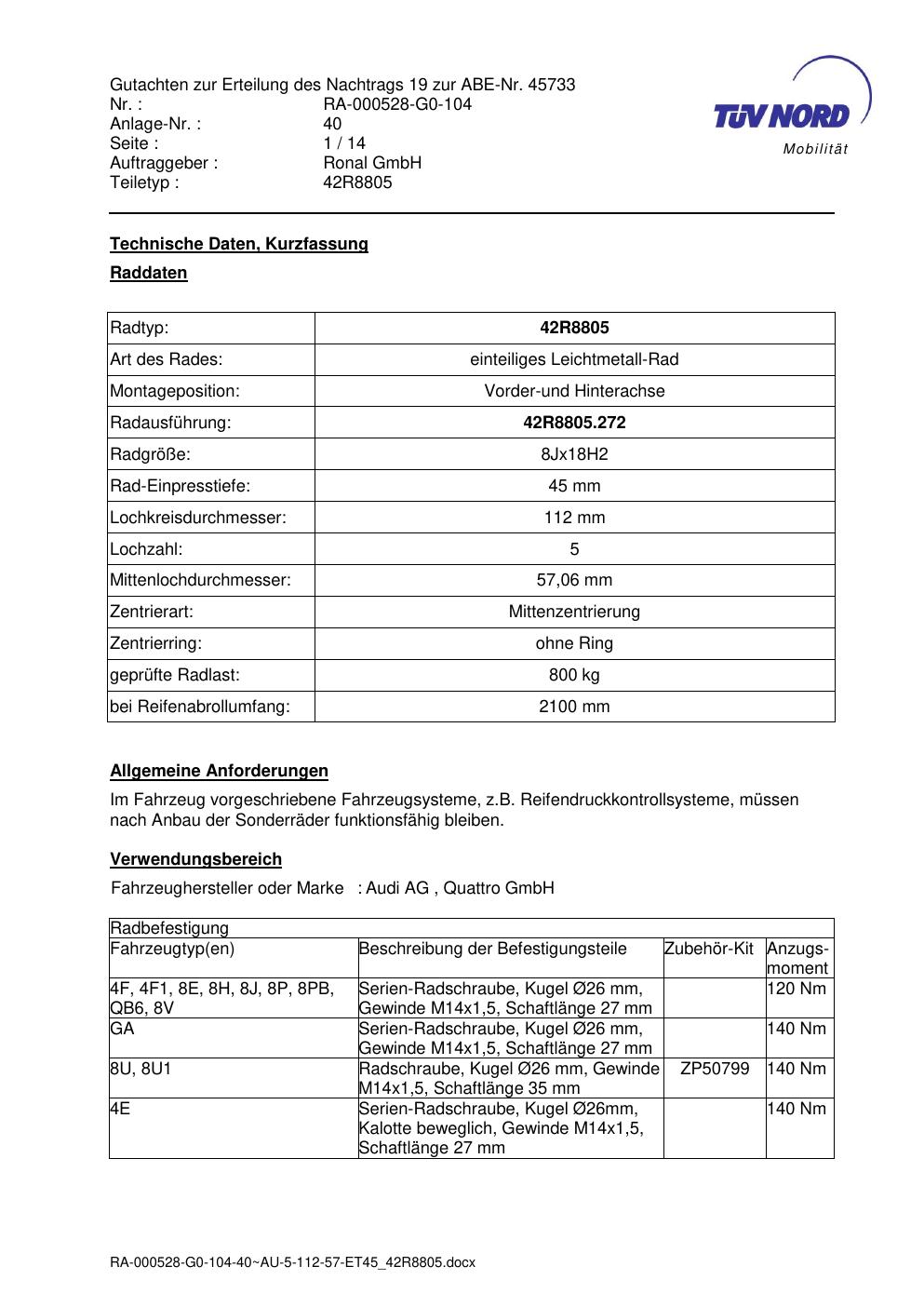 Dieses Gutachten (abe) bezieht sich auf die Alufelge brand-ronal 42R8805 in der Ausführung 8Jx18 ET 0, Mittenloch 0 mm (KBA 45733). Im PDF findest du typischerweise zulässige Reifengrößen, Auflagen/Anbauhinweise und – je nach Dokument – Hinweise zur Eintragung.