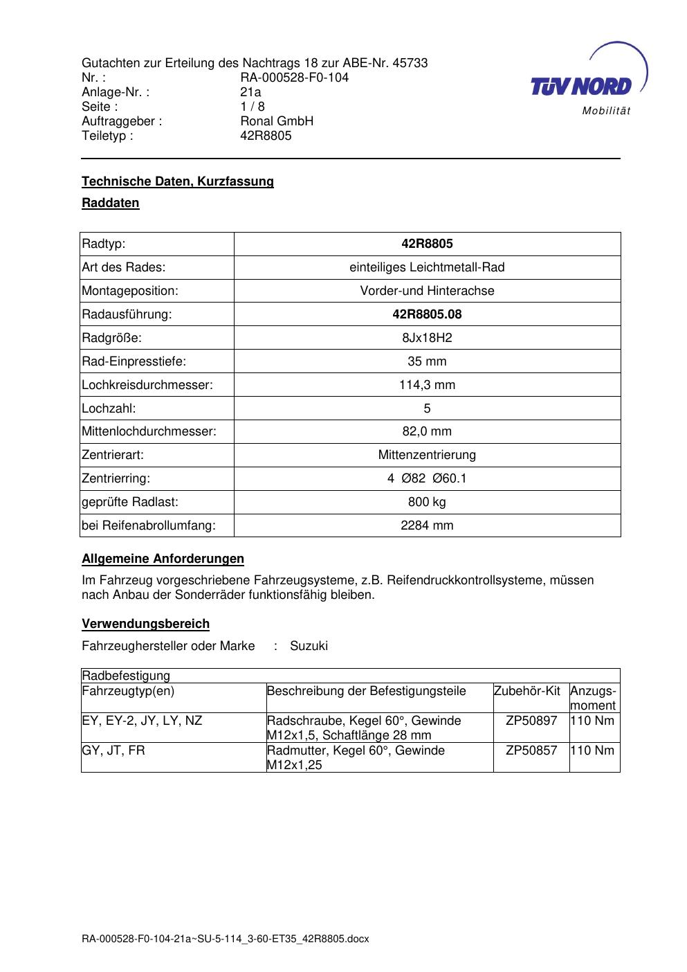 Dieses Gutachten (abe) bezieht sich auf die Alufelge brand-ronal 42R8805 in der Ausführung 8Jx18 ET 0, Mittenloch 0 mm (KBA 45733). Im PDF findest du typischerweise zulässige Reifengrößen, Auflagen/Anbauhinweise und – je nach Dokument – Hinweise zur Eintragung.