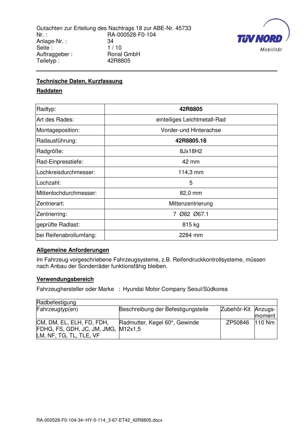 Dieses Gutachten (abe) bezieht sich auf die Alufelge brand-ronal 42R8805 in der Ausführung 8Jx18 ET 0, Mittenloch 0 mm (KBA 45733). Im PDF findest du typischerweise zulässige Reifengrößen, Auflagen/Anbauhinweise und – je nach Dokument – Hinweise zur Eintragung.