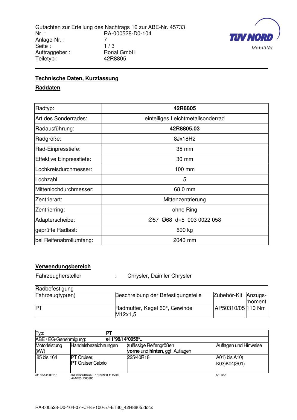 Dieses Gutachten (abe) bezieht sich auf die Alufelge brand-ronal 42R8805 in der Ausführung 8Jx18 ET 0, Mittenloch 0 mm (KBA 45733). Im PDF findest du typischerweise zulässige Reifengrößen, Auflagen/Anbauhinweise und – je nach Dokument – Hinweise zur Eintragung.