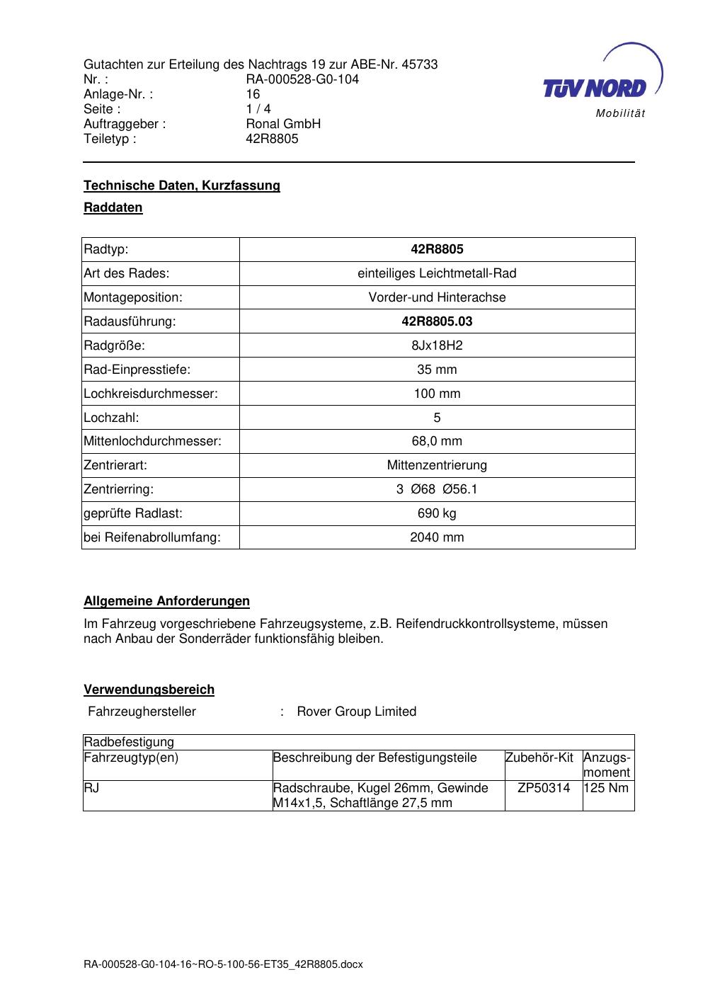 Dieses Gutachten (abe) bezieht sich auf die Alufelge brand-ronal 42R8805 in der Ausführung 8Jx18 ET 0, Mittenloch 0 mm (KBA 45733). Im PDF findest du typischerweise zulässige Reifengrößen, Auflagen/Anbauhinweise und – je nach Dokument – Hinweise zur Eintragung.