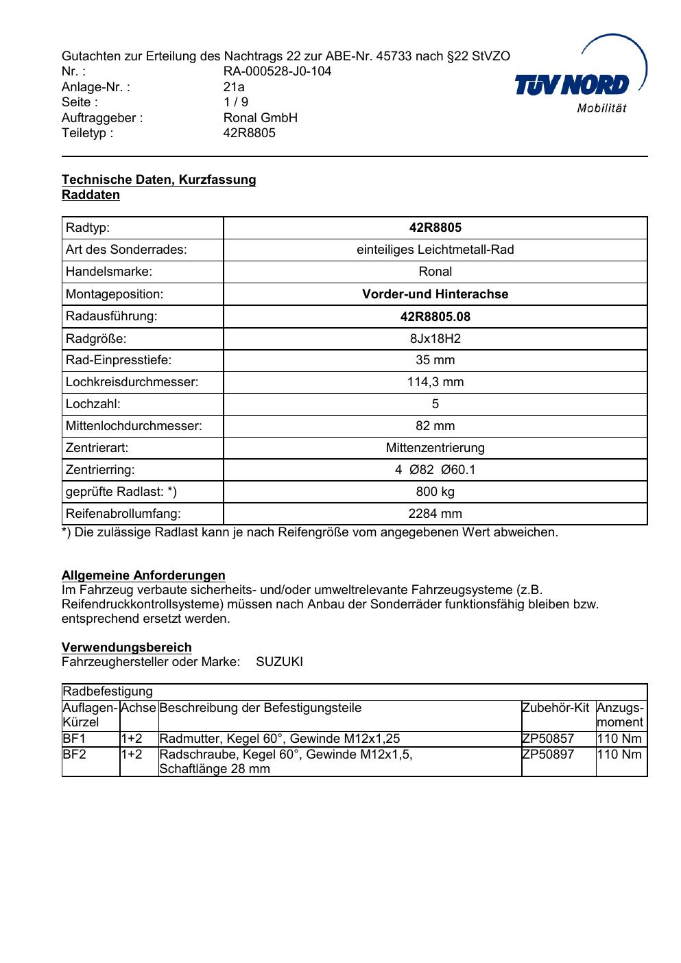 Dieses Gutachten (abe) bezieht sich auf die Alufelge brand-ronal 42R8805 in der Ausführung 8Jx18 ET 0, Mittenloch 0 mm (KBA 45733). Im PDF findest du typischerweise zulässige Reifengrößen, Auflagen/Anbauhinweise und – je nach Dokument – Hinweise zur Eintragung.