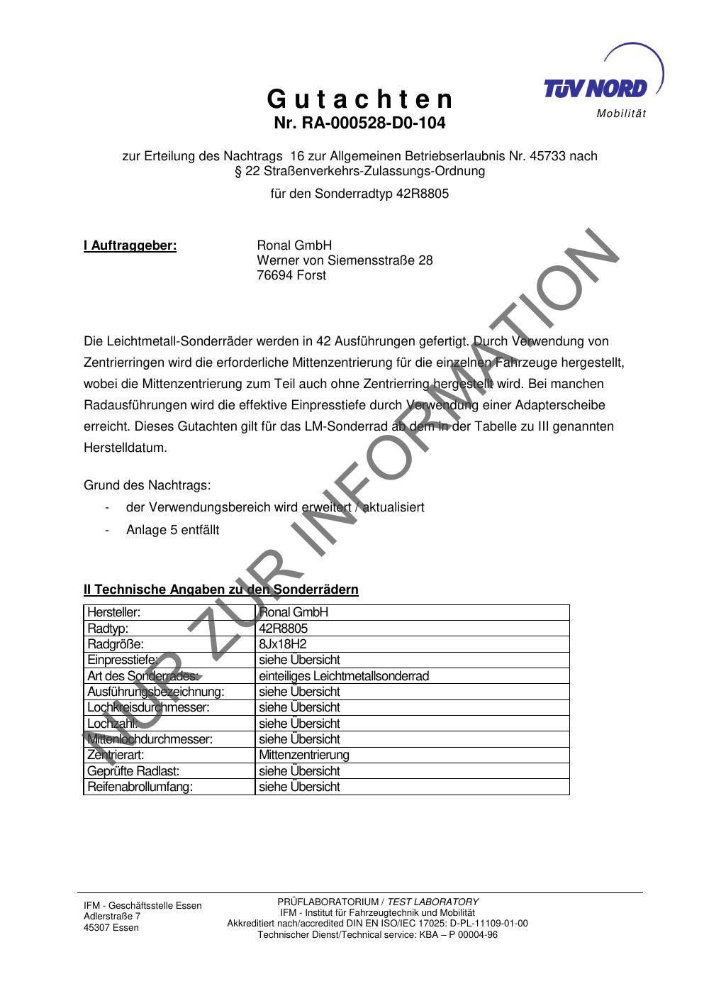 Dieses Gutachten (abe) bezieht sich auf die Alufelge brand-ronal 42R8805 in der Ausführung 8Jx18 ET 0, Mittenloch 0 mm (KBA 45733). Im PDF findest du typischerweise zulässige Reifengrößen, Auflagen/Anbauhinweise und – je nach Dokument – Hinweise zur Eintragung.