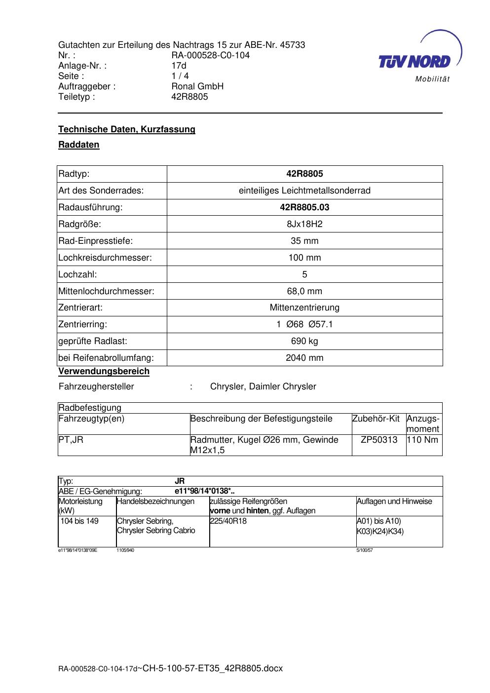 Dieses Gutachten (abe) bezieht sich auf die Alufelge brand-ronal 42R8805 in der Ausführung 8Jx18 ET 0, Mittenloch 0 mm (KBA 45733). Im PDF findest du typischerweise zulässige Reifengrößen, Auflagen/Anbauhinweise und – je nach Dokument – Hinweise zur Eintragung.