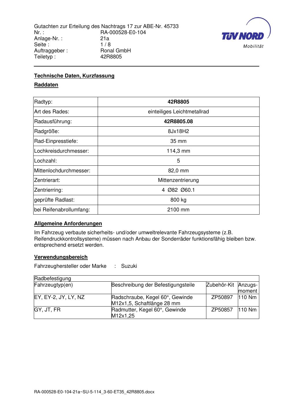 Dieses Gutachten (abe) bezieht sich auf die Alufelge brand-ronal 42R8805 in der Ausführung 8Jx18 ET 0, Mittenloch 0 mm (KBA 45733). Im PDF findest du typischerweise zulässige Reifengrößen, Auflagen/Anbauhinweise und – je nach Dokument – Hinweise zur Eintragung.