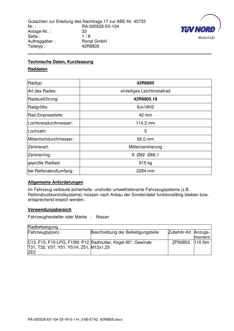 Dieses Gutachten (abe) bezieht sich auf die Alufelge brand-ronal 42R8805 in der Ausführung 8Jx18 ET 0, Mittenloch 0 mm (KBA 45733). Im PDF findest du typischerweise zulässige Reifengrößen, Auflagen/Anbauhinweise und – je nach Dokument – Hinweise zur Eintragung.