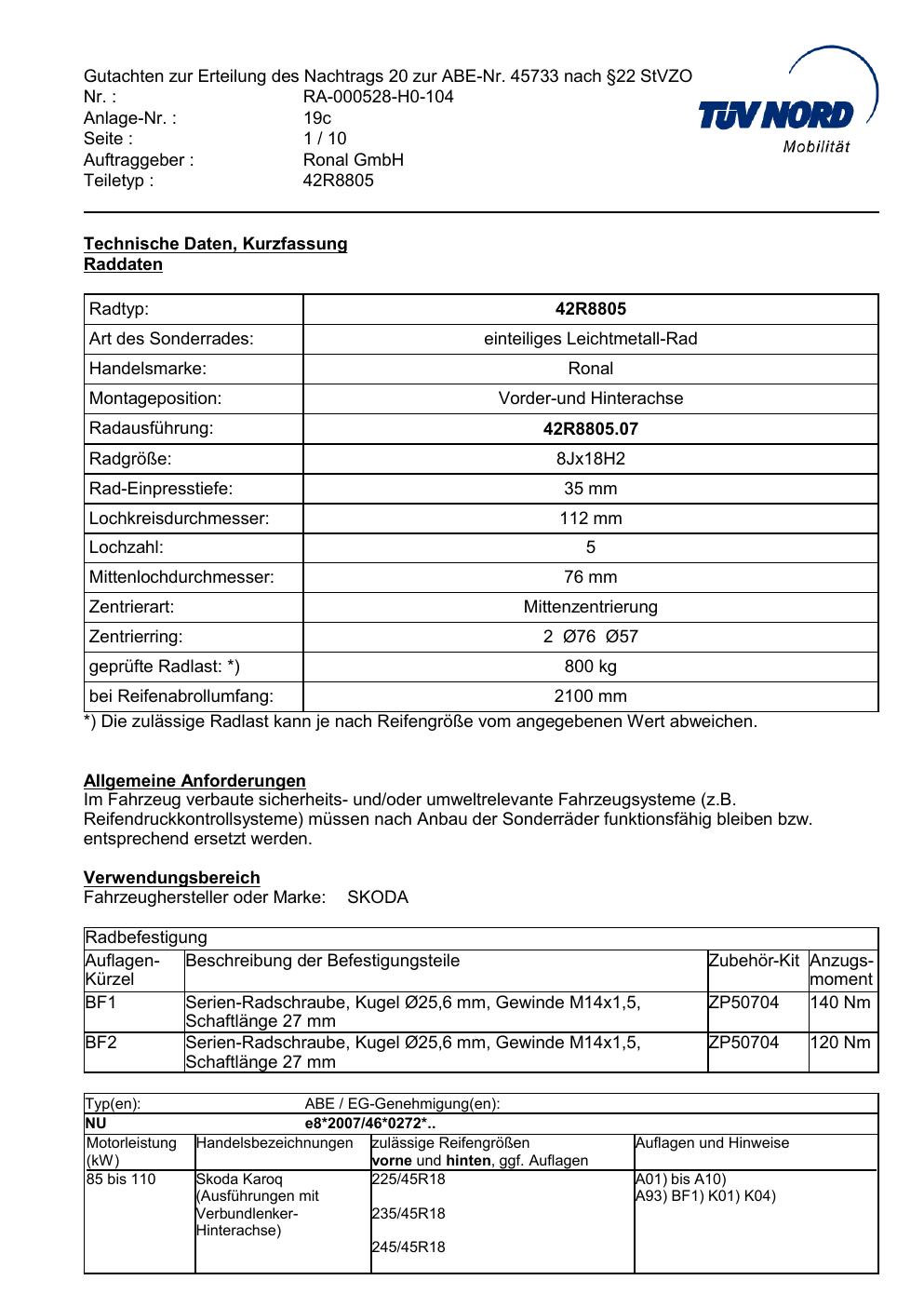 Dieses Gutachten (abe) bezieht sich auf die Alufelge brand-ronal 42R8805 in der Ausführung 8Jx18 ET 0, Mittenloch 0 mm (KBA 45733). Im PDF findest du typischerweise zulässige Reifengrößen, Auflagen/Anbauhinweise und – je nach Dokument – Hinweise zur Eintragung.