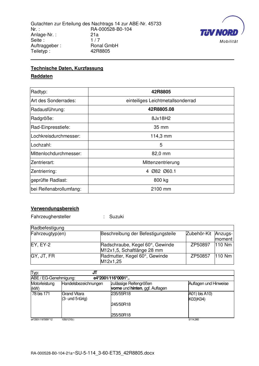 Dieses Gutachten (abe) bezieht sich auf die Alufelge brand-ronal 42R8805 in der Ausführung 8Jx18 ET 0, Mittenloch 0 mm (KBA 45733). Im PDF findest du typischerweise zulässige Reifengrößen, Auflagen/Anbauhinweise und – je nach Dokument – Hinweise zur Eintragung.