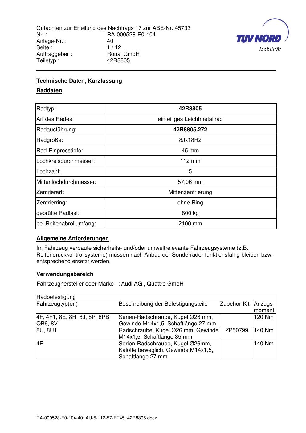 Dieses Gutachten (abe) bezieht sich auf die Alufelge brand-ronal 42R8805 in der Ausführung 8Jx18 ET 0, Mittenloch 0 mm (KBA 45733). Im PDF findest du typischerweise zulässige Reifengrößen, Auflagen/Anbauhinweise und – je nach Dokument – Hinweise zur Eintragung.