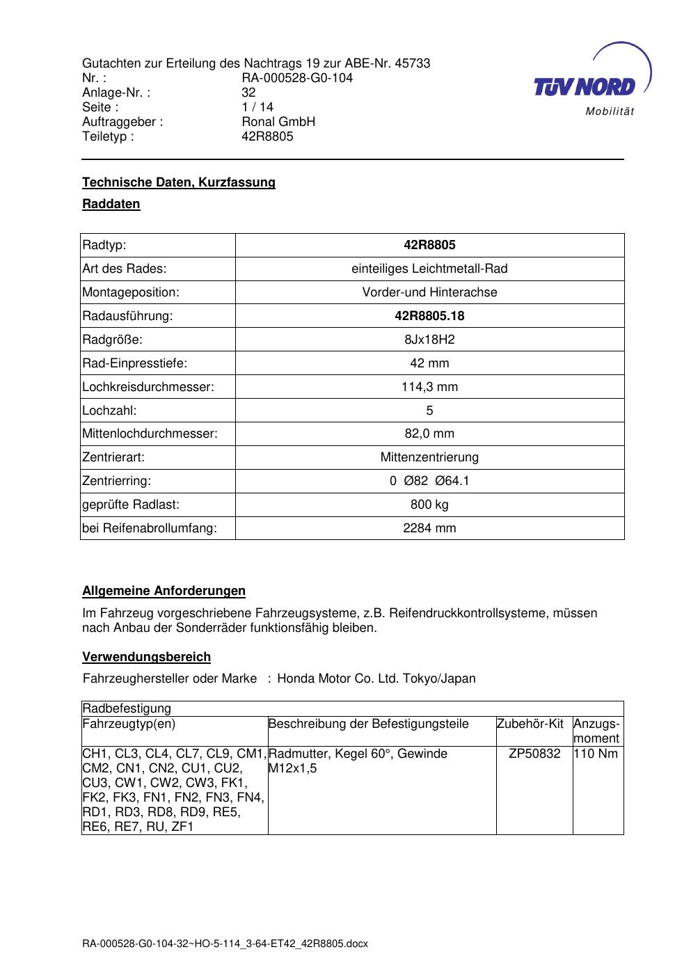 Dieses Gutachten (abe) bezieht sich auf die Alufelge brand-ronal 42R8805 in der Ausführung 8Jx18 ET 0, Mittenloch 0 mm (KBA 45733). Im PDF findest du typischerweise zulässige Reifengrößen, Auflagen/Anbauhinweise und – je nach Dokument – Hinweise zur Eintragung.
