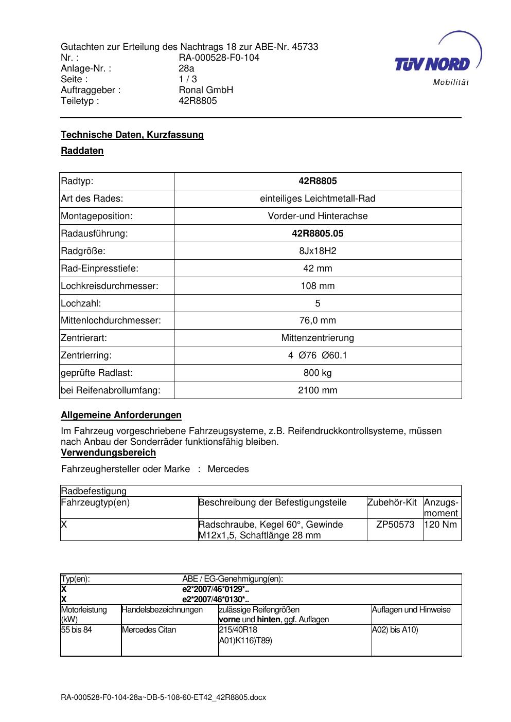 Dieses Gutachten (abe) bezieht sich auf die Alufelge brand-ronal 42R8805 in der Ausführung 8Jx18 ET 0, Mittenloch 0 mm (KBA 45733). Im PDF findest du typischerweise zulässige Reifengrößen, Auflagen/Anbauhinweise und – je nach Dokument – Hinweise zur Eintragung.