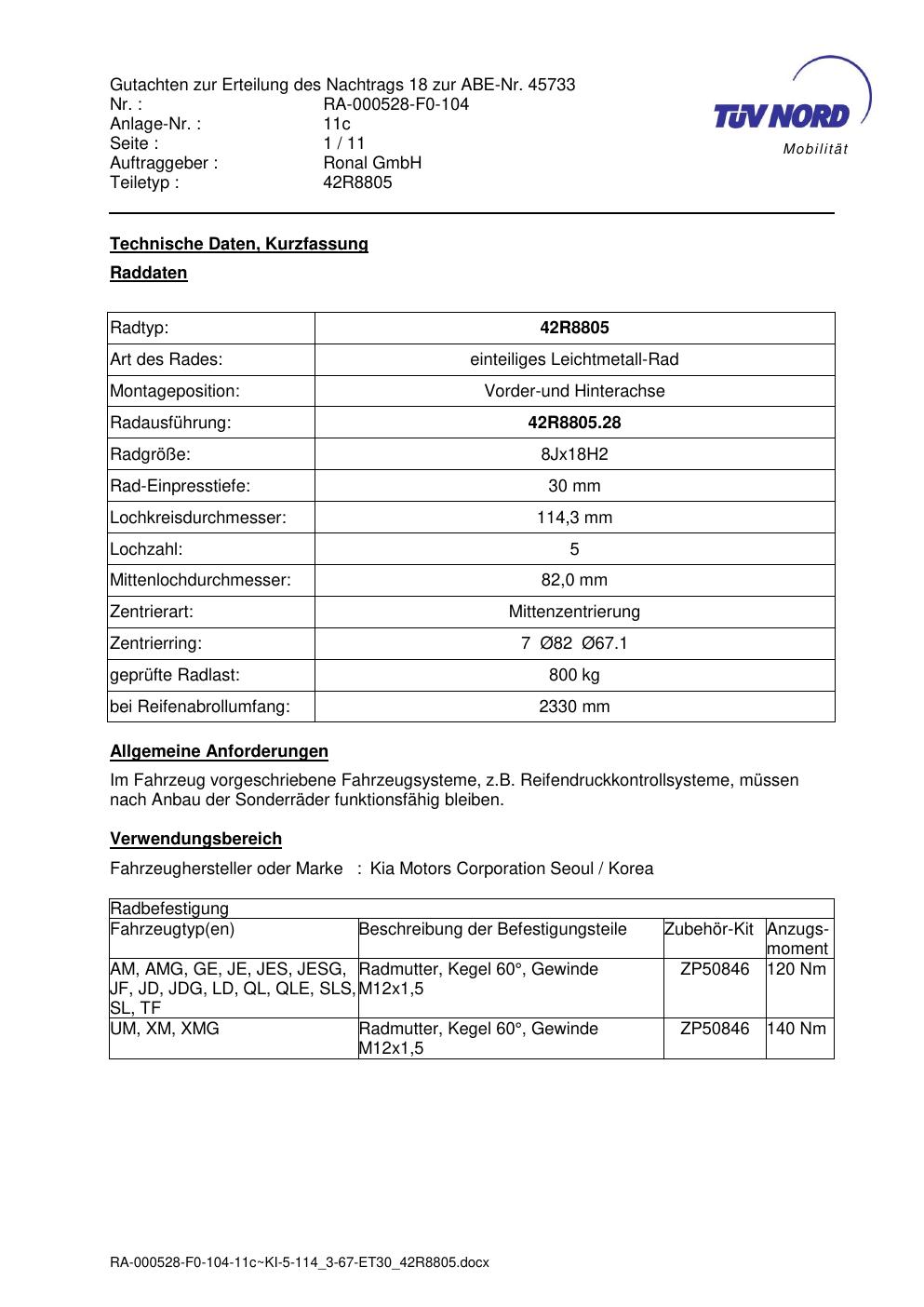 Dieses Gutachten (abe) bezieht sich auf die Alufelge brand-ronal 42R8805 in der Ausführung 8Jx18 ET 0, Mittenloch 0 mm (KBA 45733). Im PDF findest du typischerweise zulässige Reifengrößen, Auflagen/Anbauhinweise und – je nach Dokument – Hinweise zur Eintragung.
