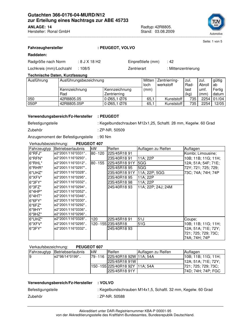 Dieses Gutachten (abe) bezieht sich auf die Alufelge Ronal 42R8805 in der Ausführung 8Jx18 ET 0, Mittenloch 0 mm (KBA 45733). Im PDF findest du typischerweise zulässige Reifengrößen, Auflagen/Anbauhinweise und – je nach Dokument – Hinweise zur Eintragung.