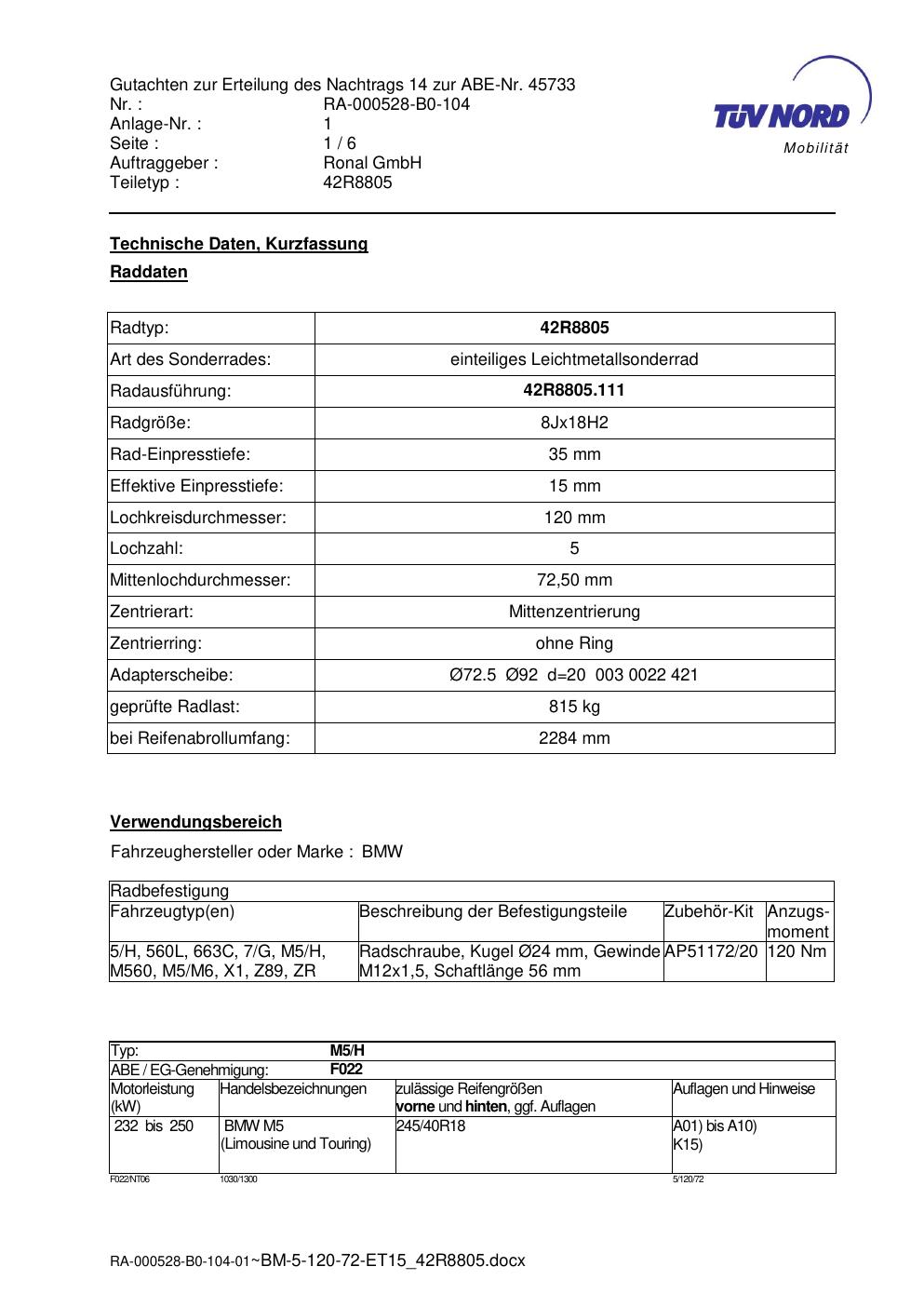 Dieses Gutachten (abe) bezieht sich auf die Alufelge brand-ronal 42R8805 in der Ausführung 8Jx18 ET 0, Mittenloch 0 mm (KBA 45733). Im PDF findest du typischerweise zulässige Reifengrößen, Auflagen/Anbauhinweise und – je nach Dokument – Hinweise zur Eintragung.